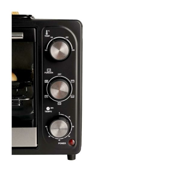 Con 18 litros de capacidad, es el tamaño ideal para que prepares o calientes grandes o pequeñas porciones de comida. Cuenta con control de temperatura hasta 250°C, temporizador hasta 60 minutos, y selector de funciones para que elijas entre 5 funciones la que más se adapte a tu preparación, entre estas opciones cuentas con la función rostizador para tener cocciones uniformes. Además, cuenta con bandeja superior para asar o calentar mientras horneas._x000D_